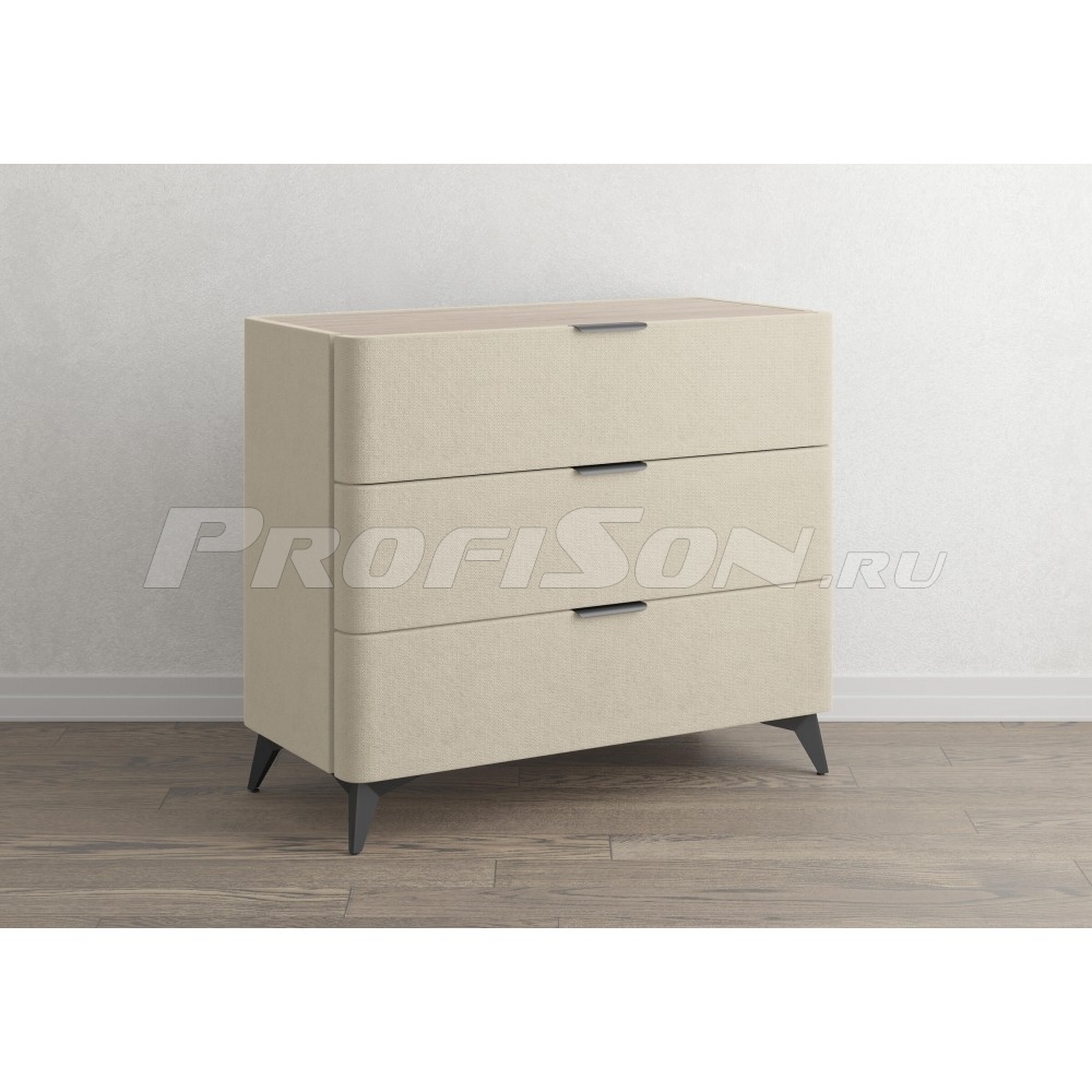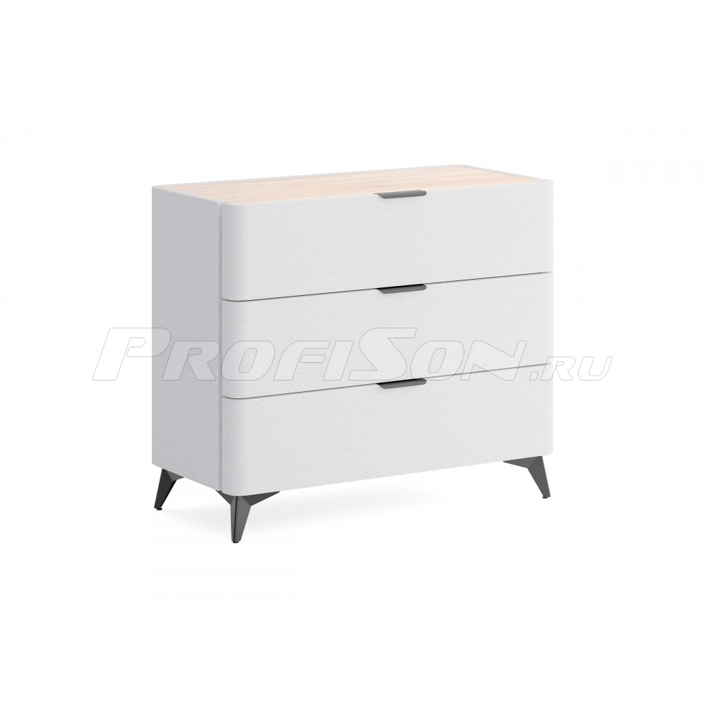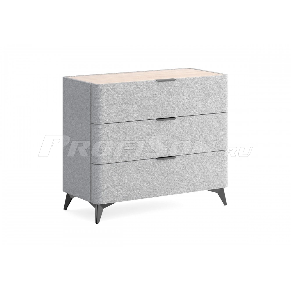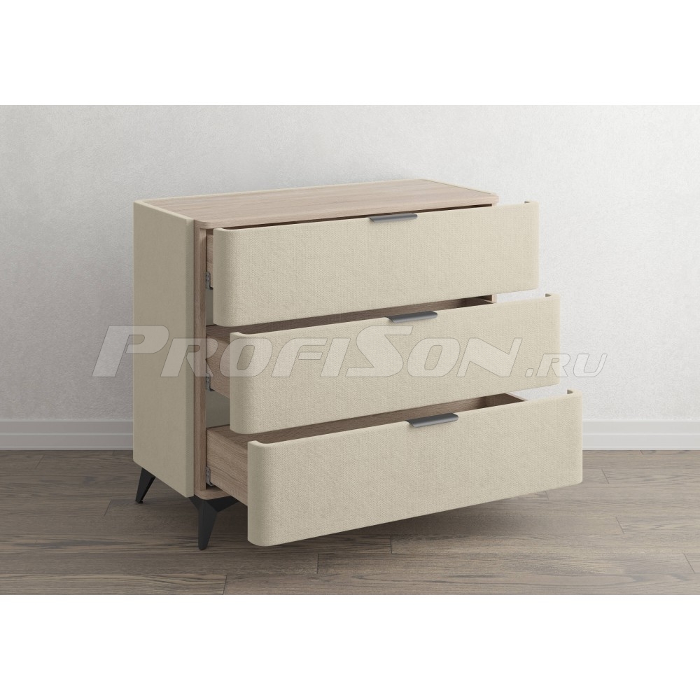 Комод Сонум Sheldon 3 ящика - дизайнерский интерьерный комод современного стиля в обивке из мебельной ткани на высоких ножках. Образец функциональности и эстетики. Закругленные фасады ящиков смотрятся стильно и гармонично. Поверхность комода выполнена из ЛДСП в цвете «Дуб Сонома», что придает данной модели теплоту и натуральность, создает уникальный контраст с мягким корпусом. Такое исполнение является не только дизайнеским, но и практичным решением. За гладкой поверхностью легко ухаживать, она не подвержена быстрому износу и загрязнению. На ровной жесткой столешнице удобно размещать необходимые предметы. Изящные металлические ручки и высокие металлические ножки подчеркивают утончённый дизайн комода Шелдон. Ящики на скрытых направляющих оснащены доводчиками, обеспечивающими мягкое закрывание, а скруглённые углы добавляет стиля, удобства и безопасности.