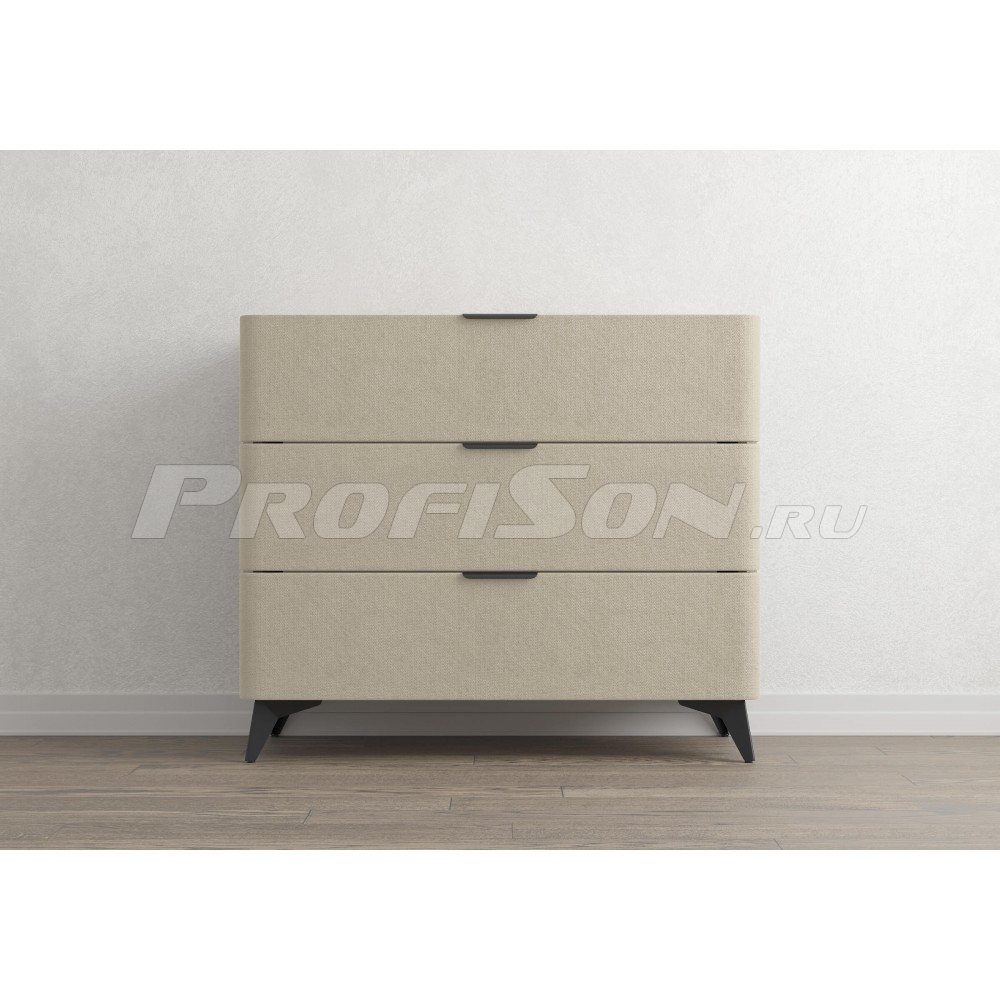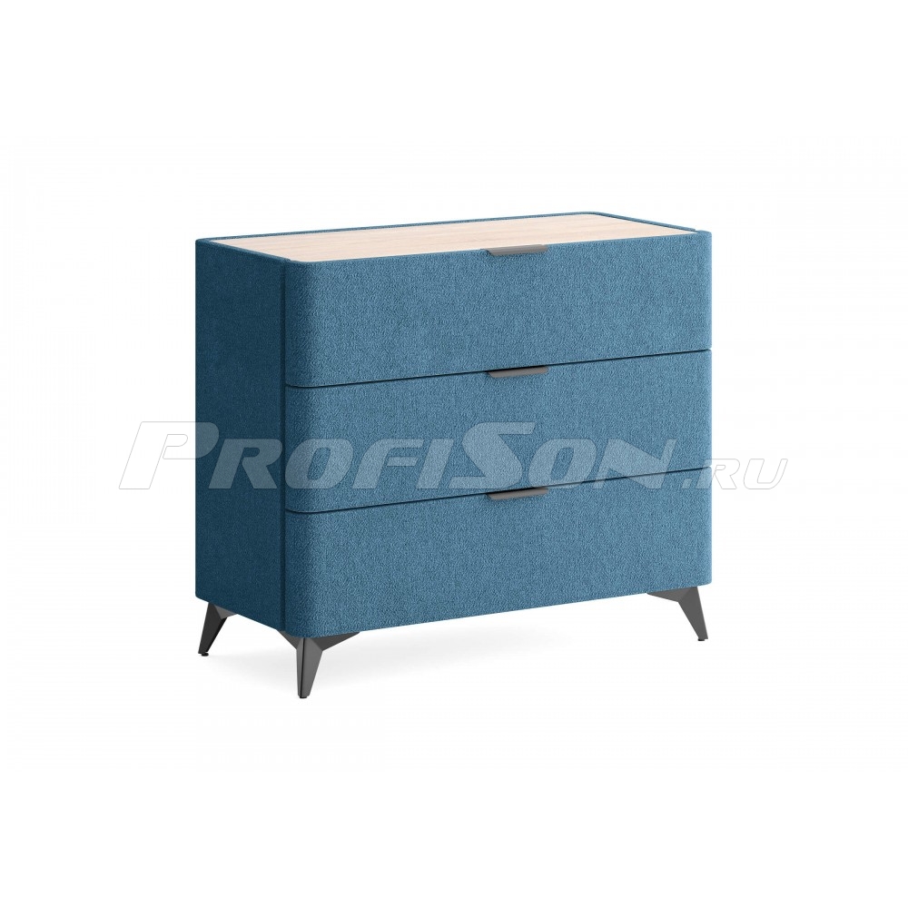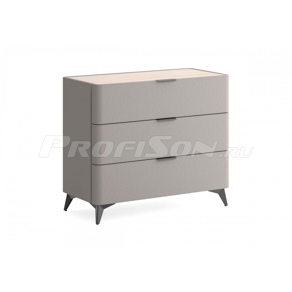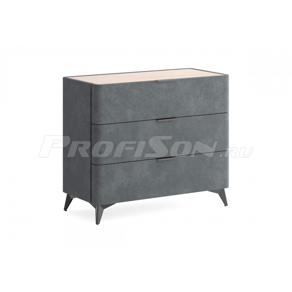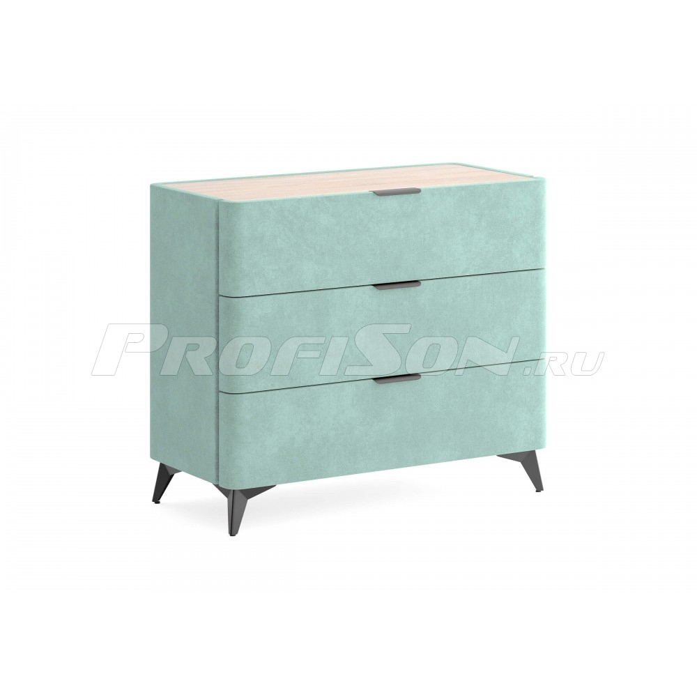 Комод Сонум Sheldon 3 ящика - дизайнерский интерьерный комод современного стиля в обивке из мебельной ткани на высоких ножках. Образец функциональности и эстетики. Закругленные фасады ящиков смотрятся стильно и гармонично. Поверхность комода выполнена из ЛДСП в цвете «Дуб Сонома», что придает данной модели теплоту и натуральность, создает уникальный контраст с мягким корпусом. Такое исполнение является не только дизайнеским, но и практичным решением. За гладкой поверхностью легко ухаживать, она не подвержена быстрому износу и загрязнению. На ровной жесткой столешнице удобно размещать необходимые предметы. Изящные металлические ручки и высокие металлические ножки подчеркивают утончённый дизайн комода Шелдон. Ящики на скрытых направляющих оснащены доводчиками, обеспечивающими мягкое закрывание, а скруглённые углы добавляет стиля, удобства и безопасности.