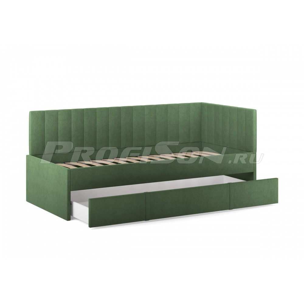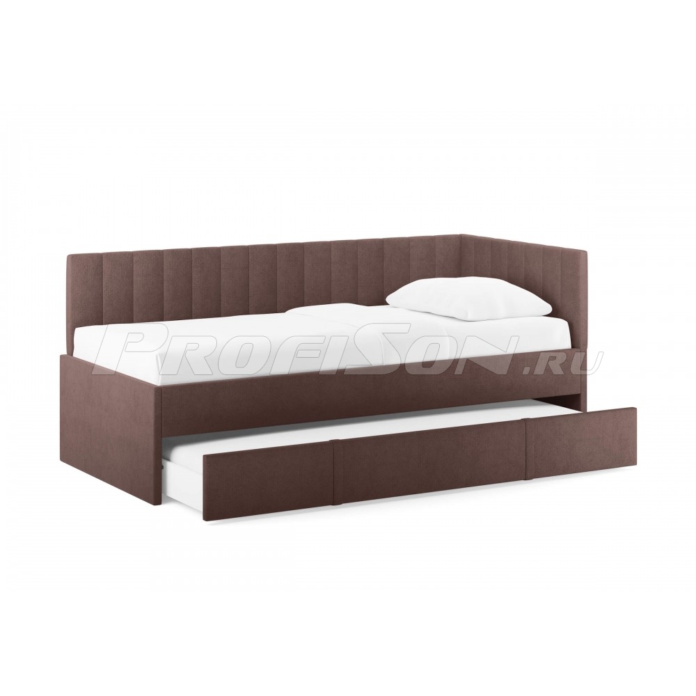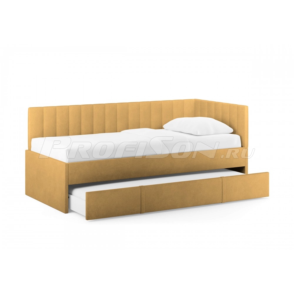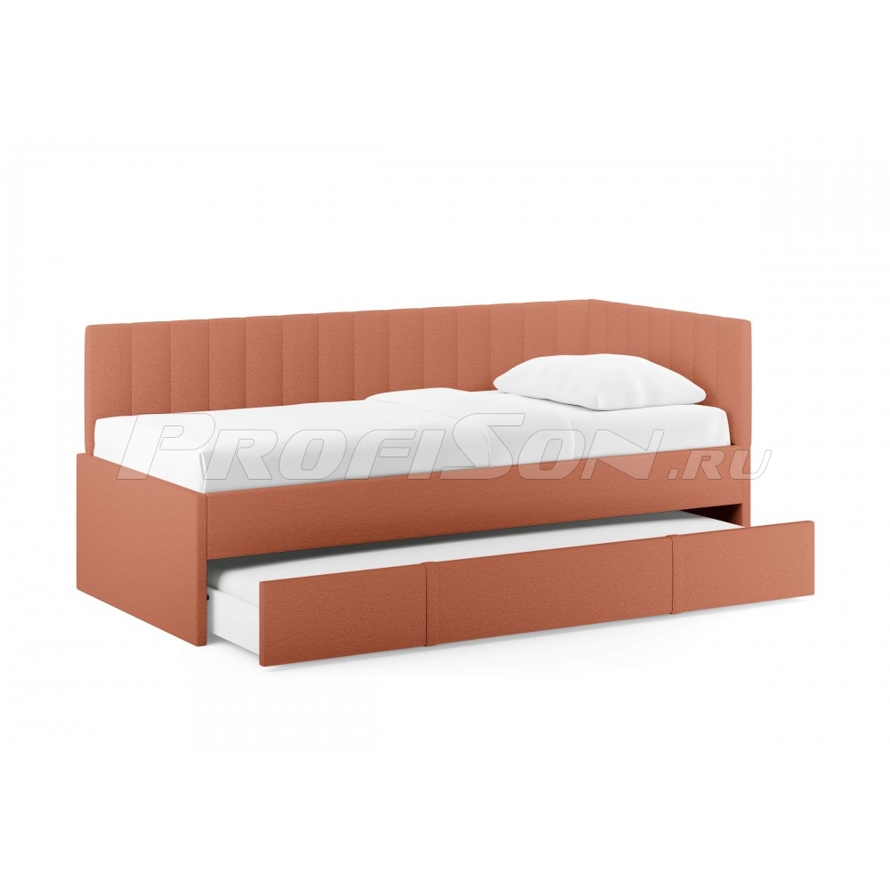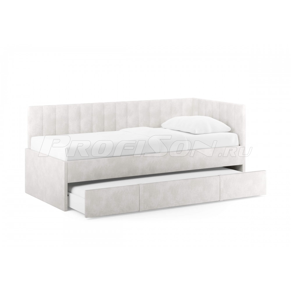 Emily, оснащенная удобным выдвижным ящиком, который легко превращается во второе спальное место или вместительный короб для хранения вещей и белья. Идеальное решение для комфортного сна и экономии пространства. Современная кровать - воплощение удобства и яркого дизайна. Универсальный боковой элемент устанавливается как с левой, так и с правой стороны - подстраивается под любую комнату. Кровать-софа с одной боковой спинкой станет отличным решением как для гостиной, так и спальни. Также это отличный вариант спального места для детей и подростков. Возможно использование в качестве дивана и дополнительного спального места (например, для гостей). Лаконичный стиль изделия и разнообразие выбора обивки позволит легко комбинировать кровать с любой другой мебелью. При сочетании с интерьерными подушками - кровать выглядит, как аккуратный диван, при этом не перестает быть качественным спальным местом в сочетании с матрасом. Благодаря простоте форм и легкому дизайну кровать будет смотреться модно, стильно и элегантно в любом интерьере. Боковую спинку кровати можно установить на правую или левую сторону, что делает модель универсальной. Боковая спинка (которая по ширине) по умолчанию полностью обита основной тканью.
