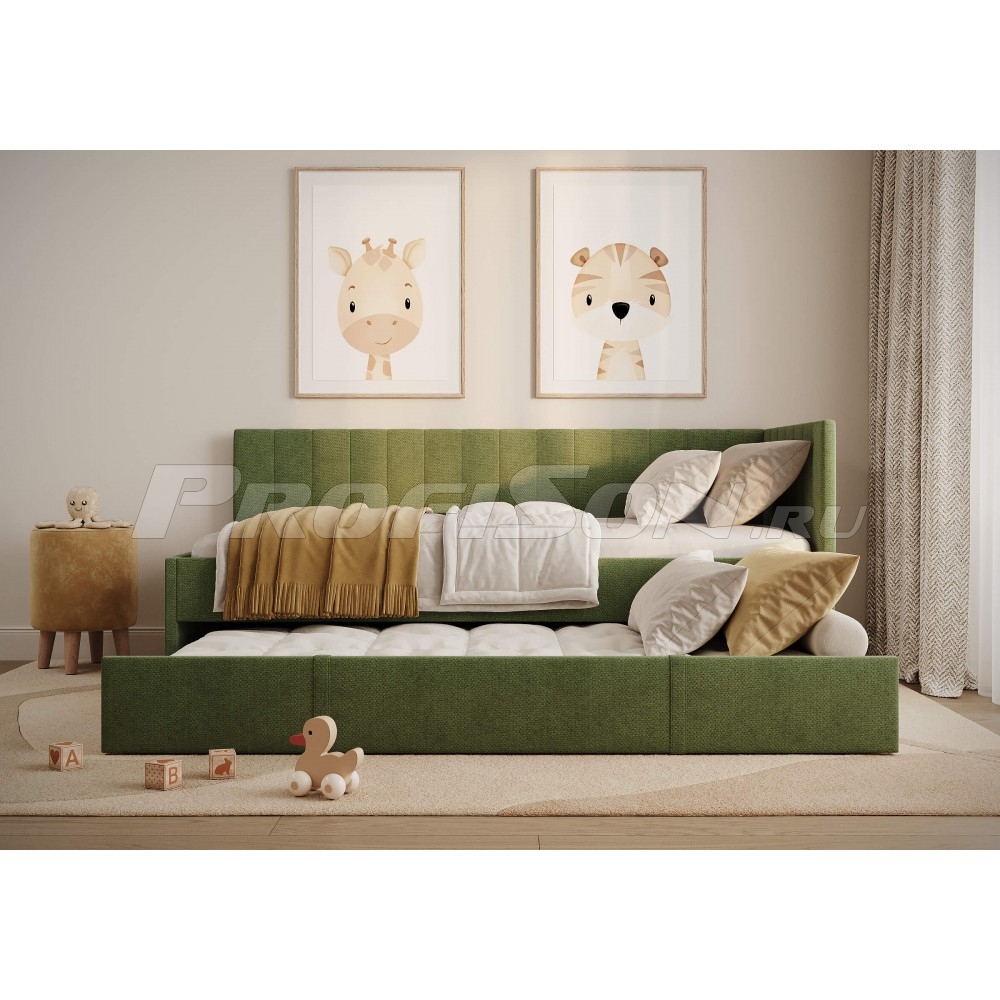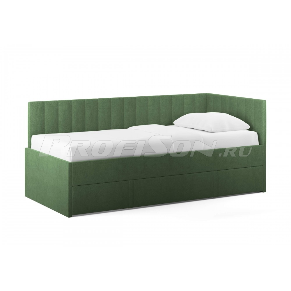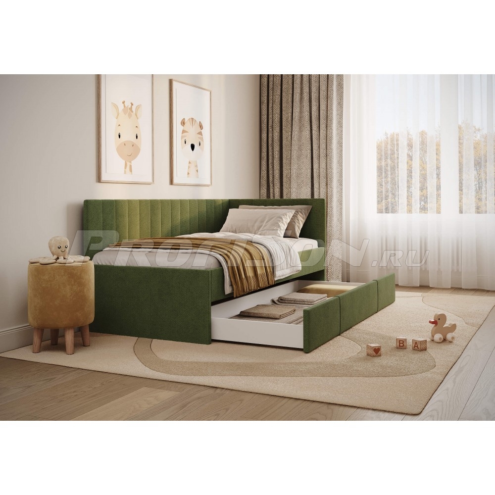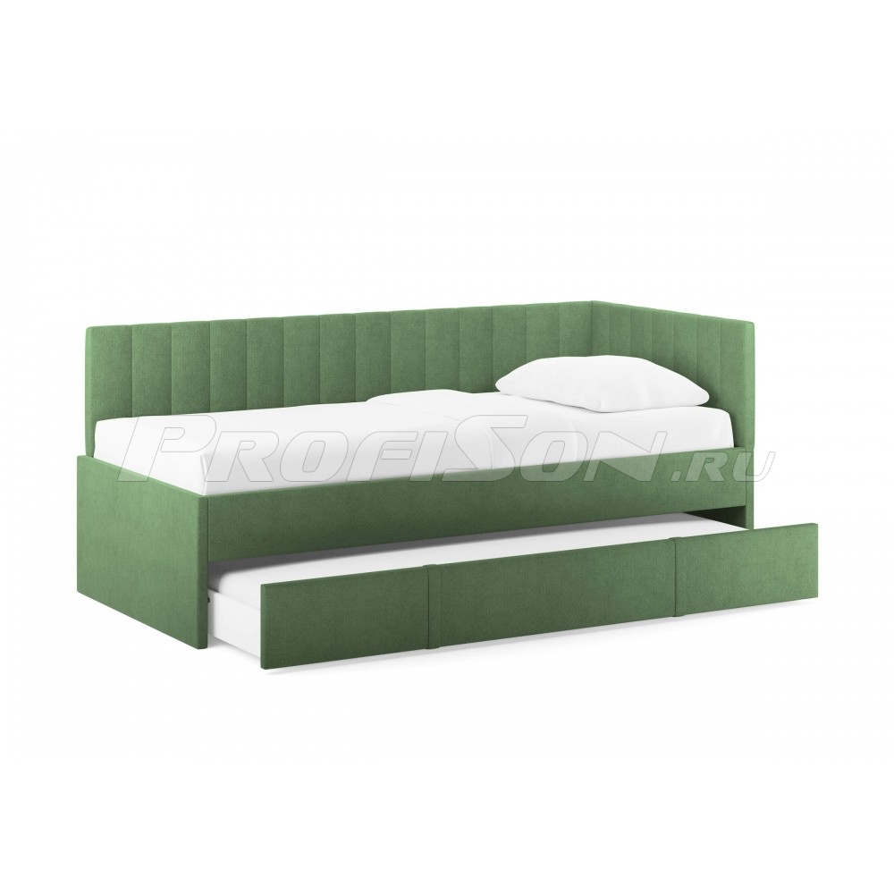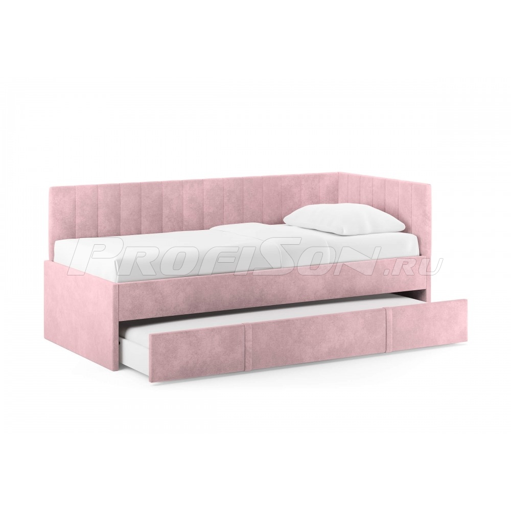 Emily, оснащенная удобным выдвижным ящиком, который легко превращается во второе спальное место или вместительный короб для хранения вещей и белья. Идеальное решение для комфортного сна и экономии пространства. Современная кровать - воплощение удобства и яркого дизайна. Универсальный боковой элемент устанавливается как с левой, так и с правой стороны - подстраивается под любую комнату. Кровать-софа с одной боковой спинкой станет отличным решением как для гостиной, так и спальни. Также это отличный вариант спального места для детей и подростков. Возможно использование в качестве дивана и дополнительного спального места (например, для гостей). Лаконичный стиль изделия и разнообразие выбора обивки позволит легко комбинировать кровать с любой другой мебелью. При сочетании с интерьерными подушками - кровать выглядит, как аккуратный диван, при этом не перестает быть качественным спальным местом в сочетании с матрасом. Благодаря простоте форм и легкому дизайну кровать будет смотреться модно, стильно и элегантно в любом интерьере. Боковую спинку кровати можно установить на правую или левую сторону, что делает модель универсальной. Боковая спинка (которая по ширине) по умолчанию полностью обита основной тканью.
