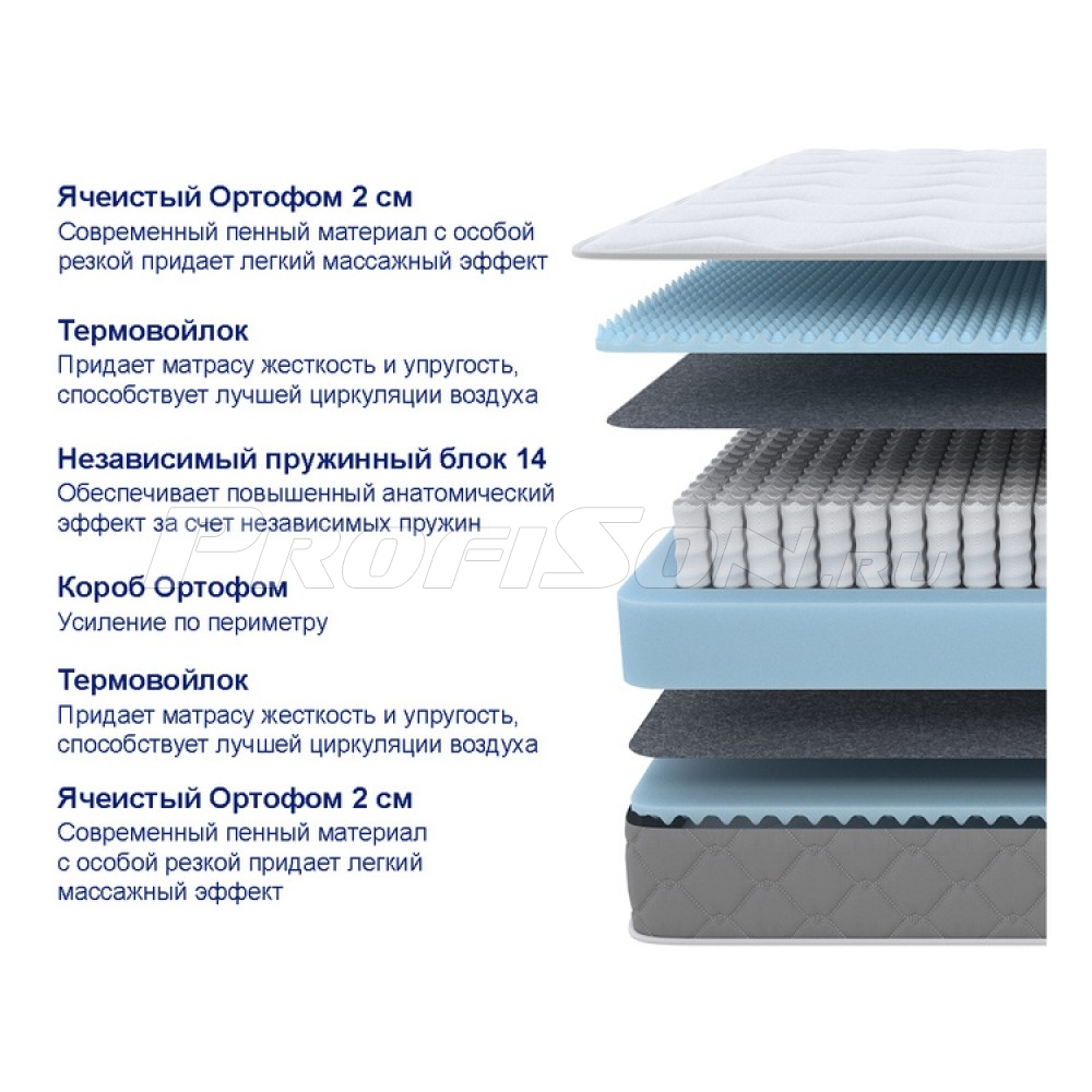 Ячеистый Ortofoam - современный экологически чистый пенный наполнитель с фигурной резкой в виде ячеек. Ячеистая структура способствует циркуляции воздуха внутри матраса, обладает высокими ортопедическими свойствами. Ортофоам с микромассажным эффектом обеспечивает правильную циркуляцию крови, нормализует тонус и восстанавливает кровообращение в мышцах, что способствует максимальному расслаблению. Рельефный слой обеспечивает бережное растяжение позвоночника, разгружая межпозвоночные диски, замедляет старение кожи за счет массажного эффекта. Преимущества материала: недорогая цена, высокая устойчивость к деформации, антиаллергенность, отсутствие посторонних запахов, не подвержен бактериальному воздействию, не задерживает влагу, хорошо проветривается. В состав Ortofoam входят только безопасные компоненты, не вызывающие аллергию. За счет высокой прочности при длительной эксплуатации Ortofoam не крошится, не выделяет пыли и других вредных веществ.
