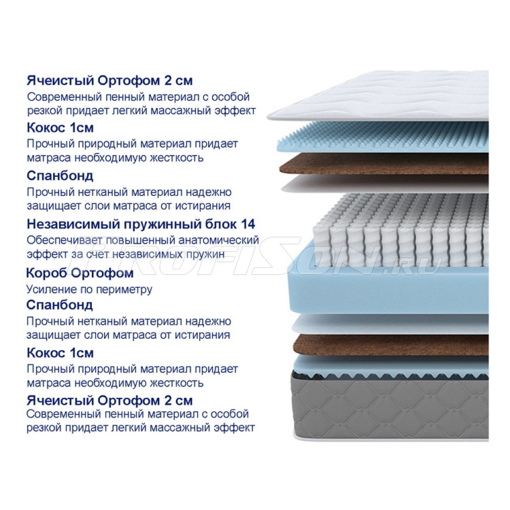 Ячеистый Ortofoam - современный экологически чистый пенный наполнитель с фигурной резкой в виде ячеек. Ячеистая структура способствует циркуляции воздуха внутри матраса, обладает высокими ортопедическими свойствами. Ортофоам с микромассажным эффектом обеспечивает правильную циркуляцию крови, нормализует тонус и восстанавливает кровообращение в мышцах, что способствует максимальному расслаблению. Рельефный слой обеспечивает бережное растяжение позвоночника, разгружая межпозвоночные диски, замедляет старение кожи за счет массажного эффекта. Преимущества материала: недорогая цена, высокая устойчивость к деформации, антиаллергенность, отсутствие посторонних запахов, не подвержен бактериальному воздействию, не задерживает влагу, хорошо проветривается. В состав Ortofoam входят только безопасные компоненты, не вызывающие аллергию. За счет высокой прочности при длительной эксплуатации Ortofoam не крошится, не выделяет пыли и других вредных веществ.