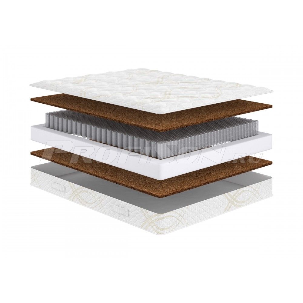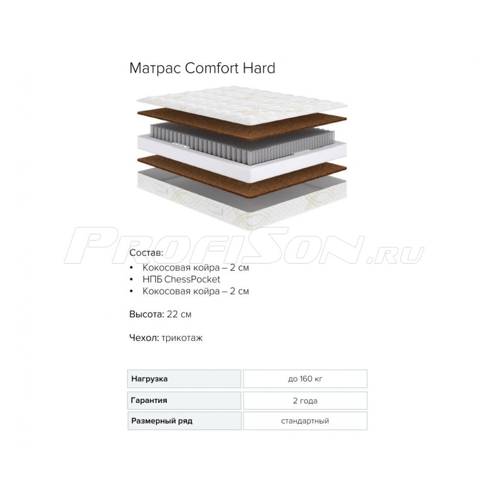 Матрас Сонум Comfort Hard - двухсторонняя модель матраса высокой жесткости. В матрасе используется кокосовая койра и современный усиленный блок независимых пружин ChessPocket, плотностью 620 пружин на спальное место. Особенность блока ChessPocket - расположение пружин в виде пчелиных сот в шахматном порядке, что позловяет избежать пустот в пружинном блоке. Такой пружинный блок максимально надежен и ортопедичен, выдерживает постоянные высокие нагрузки и допускает разницу в весе спящих. Кокосовая койра обеспечивает необходимую жесткость и уверенную поддержку, обладает воздухопроницаемостью, антибактериальными свойствами и поддерживает благоприятный микроклимат спального места. Усиление по периметру матраса из плотного пенного материала. Чехол выполнен из качественного трикотажа, простеганного на гипоаллергенном волокне. Высота матраса 22 см.