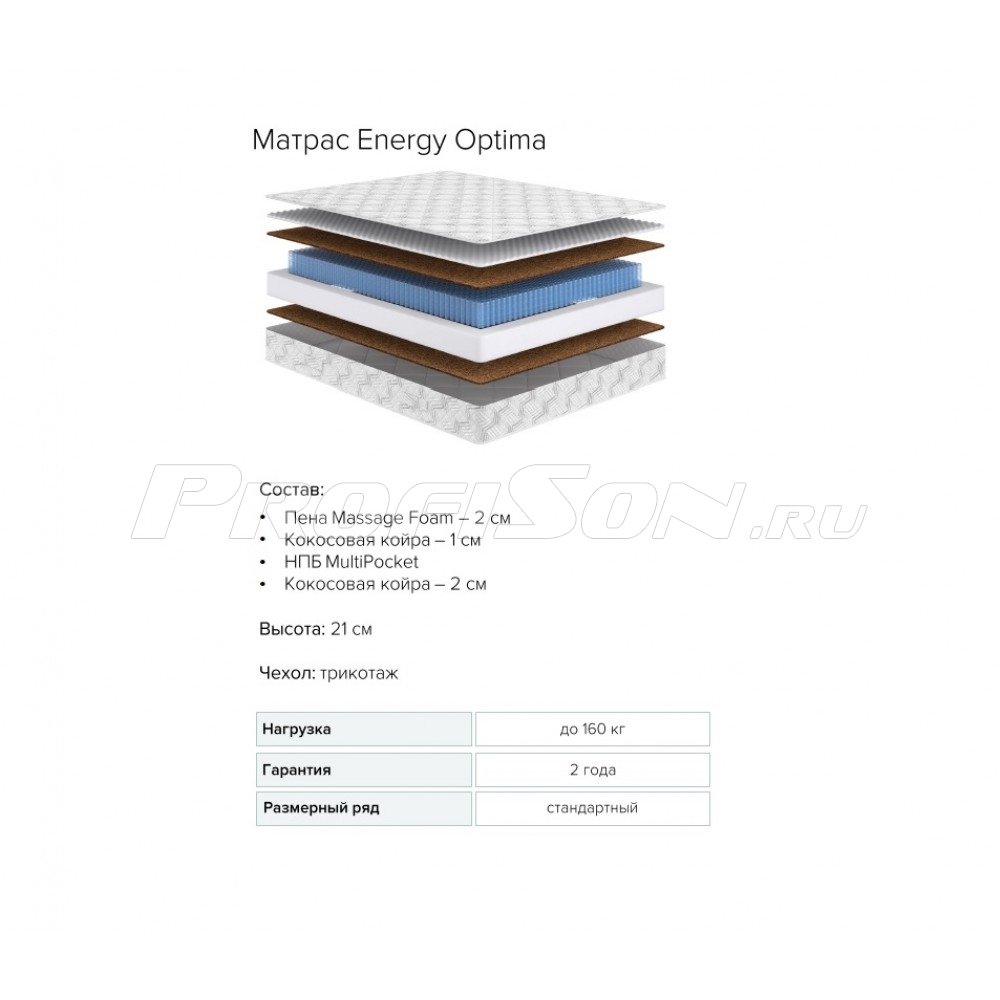 Матрас Сонум Energy Optima - двухсторонняя модель матраса с разной жесткостью сторон (средняя/жесткая). В матрасе используется кокосовая койра и пена с массажным эффектом в разном сочетании с двух сторон. Основа матраса - усиленный блок независимых пружин MultiPocket, плотностью 1000 пружин на спальное место. Использование увеличенного количества пружин небольшого диаметра повышает допустимую нагрузку и точечную реакцию, то есть способность повторять анатомическую форму тела, обеспечивают правильную поддержку позвоночника. Кокосовая койра обеспечивает необходимую жесткость и уверенную поддержку, обладает воздухопроницаемостью, антибактериальными свойствами и поддерживает благоприятный микроклимат спального места. Современный гипоаллергенный материал Massage foam создаёт комфортные условия во время сна, смягчая одну из поверхностей матраса, обеспечивает микромассаж и хорошую воздухопроводимость. Усиление по периметру матраса из плотного пенного материала. Чехол выполнен из качественного трикотажа, простеганного на гипоаллергенном волокне. Высота матраса 21 см.
