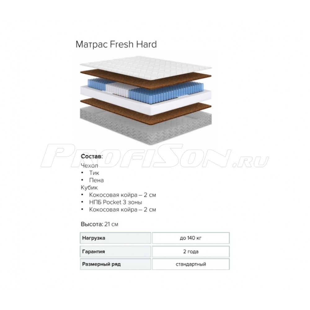 Матрас Сонум Fresh Hard - ПРОМО модель матраса высокой жесткости. Основа матраса - независимый пружинный блок Pocket 3 zone, плотностью 512 пружин на спальное место, снимает нагрузку с позвоночника и качественно поддерживает область поясницы, благодаря зонированию блока. Использование независимого блока пружин повышает точечную эластичность, то есть способность повторять форму тела, обеспечивают правильную поддержку позвоночника. Кокосовая койра увеличенной толщины обеспечивает жесткость, а современный гипоаллергенный материал Foam в составе пакета стежки придает комфорт. Комбинация наполнителей разной жесткости обеспечивает спальному месту удобство и необходимые ортопедические свойства. Матрас имеет обивку из тика, стеганного на объемном волокне и пене, борт укреплен. Высота матраса 21 см.