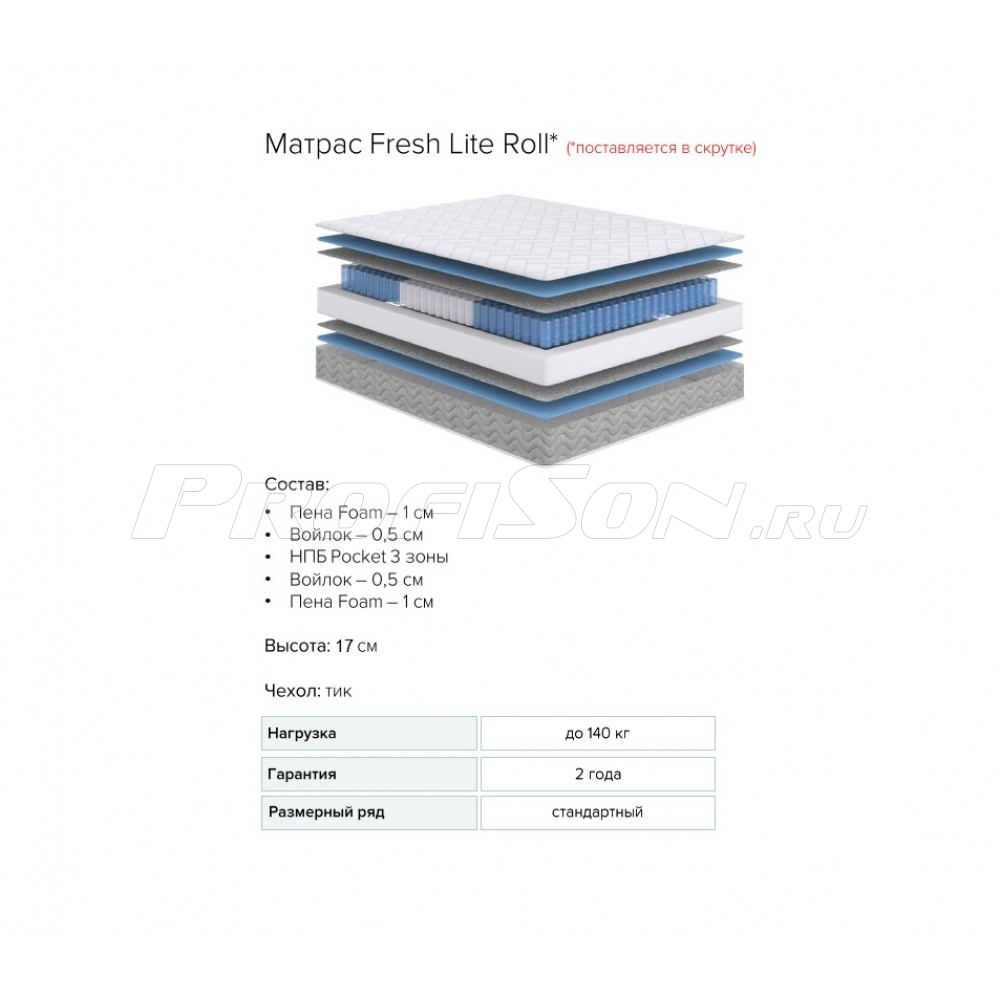 Матрас Сонум Fresh Lite Roll (бывш. Master) - недорогая модель матраса средней жесткости сторон для дома и дачи. Основа матраса - независимый пружинный блок Pocket 3 zone, плотностью 512 пружин на спальное место, снимает нагрузку с позвоночника и качественно поддерживает область поясницы, благодаря зонированию блока. Использование независимого блока пружин повышает точечную эластичность, то есть способность повторять форму тела, обеспечивают правильную поддержку позвоночника. Современный гипоаллергенный материал Foam придает комфорт и упругость спальному месту. Войлок служит хорошей изоляцией и дополнительным слоем для повышения комфорта и устойчивости к нагрузкам. Матрас имеет обивку из тика, стеганного на объемном волокне, борт укреплен. Высота матраса 17 см.