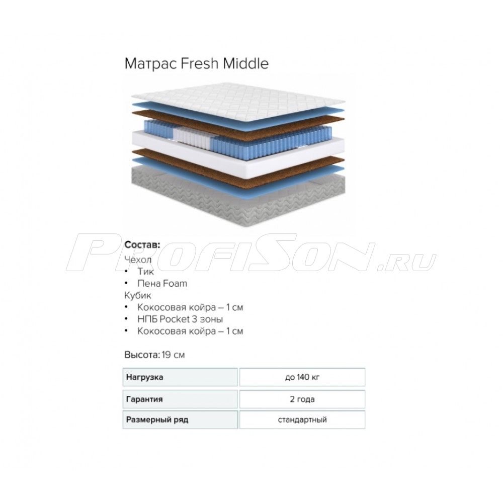 Матрас Сонум Fresh Middle - ПРОМО модель матраса, жесткость умеренная. Основа матраса - независимый пружинный блок Pocket 3 zone, плотностью 512 пружин на спальное место, снимает нагрузку с позвоночника и качественно поддерживает область поясницы, благодаря зонированию блока. Использование независимого блока пружин повышает точечную эластичность, то есть способность повторять форму тела, обеспечивают правильную поддержку позвоночника. Кокосовая койра обеспечивает жесткость, а современный гипоаллергенный материал Foam в составе пакета стежки придает комфорт. Комбинация наполнителей разной жесткости обеспечивает спальному месту удобство и необходимые ортопедические свойства. Матрас имеет обивку из тика, стеганного на объемном волокне и пене, борт укреплен. Высота матраса 19 см.