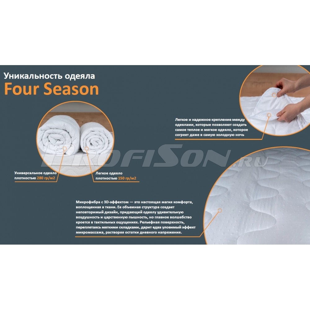 Одеяло-трансформер Орматек Four Season всесезонное - одеяло с уникальной конструкцией 3 в 1: два одеяла разной плотности, которые скрепляются между собой кнопками. Облегченное одеяло незаменимо для приятного отдыха в летний период. Всесезонное одеяло подарит уютный сон при любой погоде. Зимнее одеяло получается соединением одеял между собой кнопками, обеспечит сладкий сон в зимнюю ночь. Облегченное одеяло соединяется с всесезонным, образуя зимнее одеяло. Легкое и надежное крепление между одеялами, которые позволяют создать самое теплое и мягкое одеяло, которое согреет даже в самую холодную ночь. Микрофибра с 3D-эффектом — это настоящая магия комфорта, воплощенная в ткани. Ее объемная структура создает неповторимый дизайн, придающий одеялу удивительную воздушность и царственную пышность, но главное волшебство кроется в тактильных ощущениях. Рельефная поверхность, переплетаясь мягкими складками, дарит едва уловимый эффект микромассажа, растворяя остатки дневного напряжения.